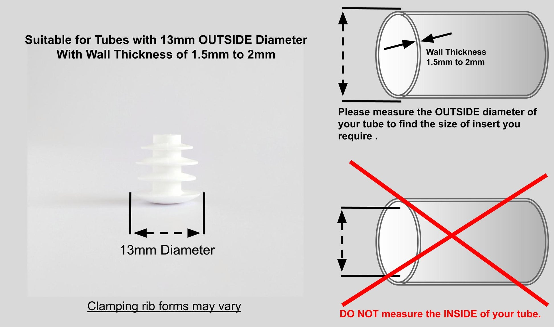 • When ordering these insert plugs, Measure the OUTSIDE diameter of the tube to find the size of insert required. These inserts are suitable for tubes with a wall thickness of 1.5mm to 2mm.