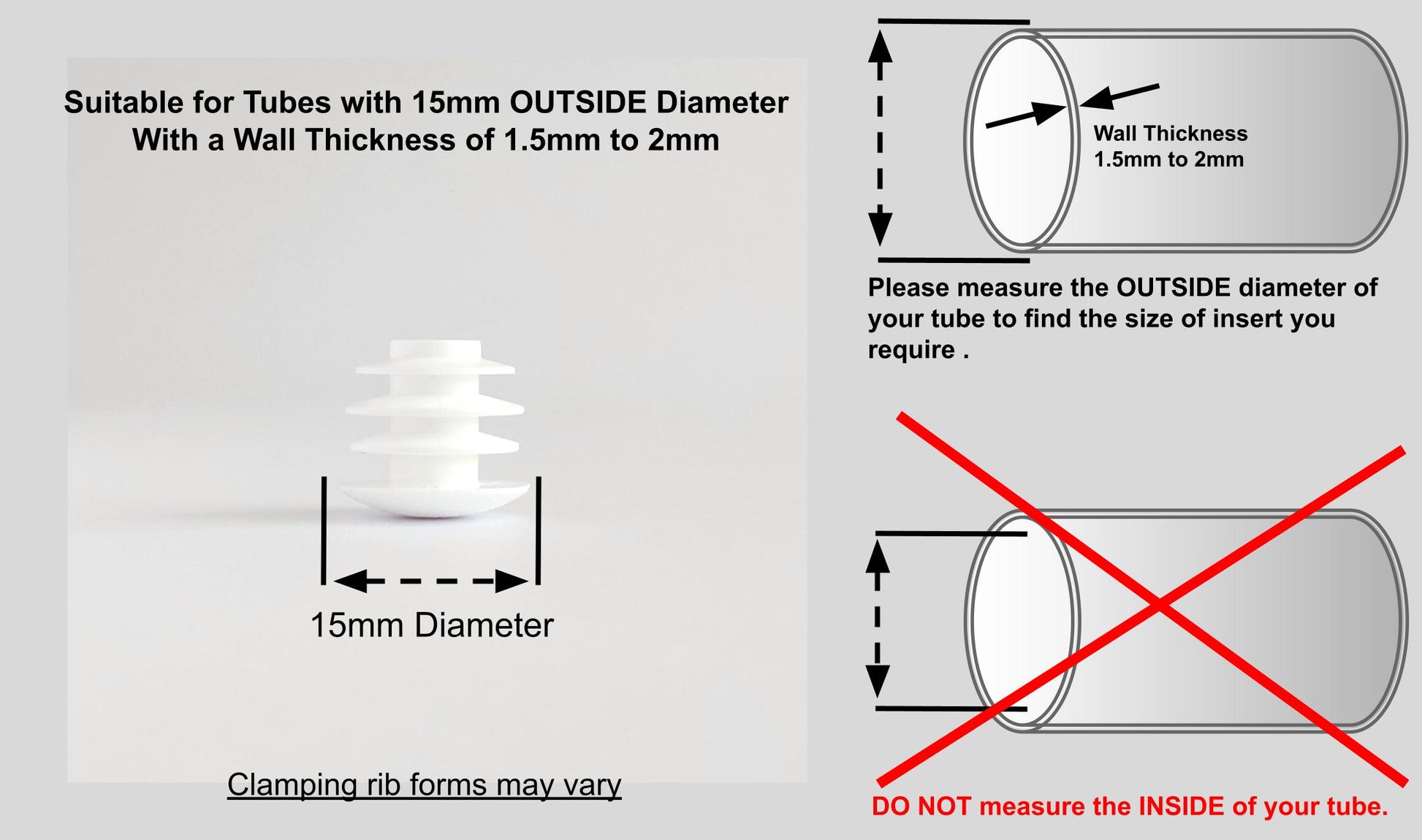 • When ordering these insert plugs, Measure the OUTSIDE diameter of the tube to find the size of insert required. These inserts are suitable for tubes with a wall thickness of 1.5mm to 2mm.