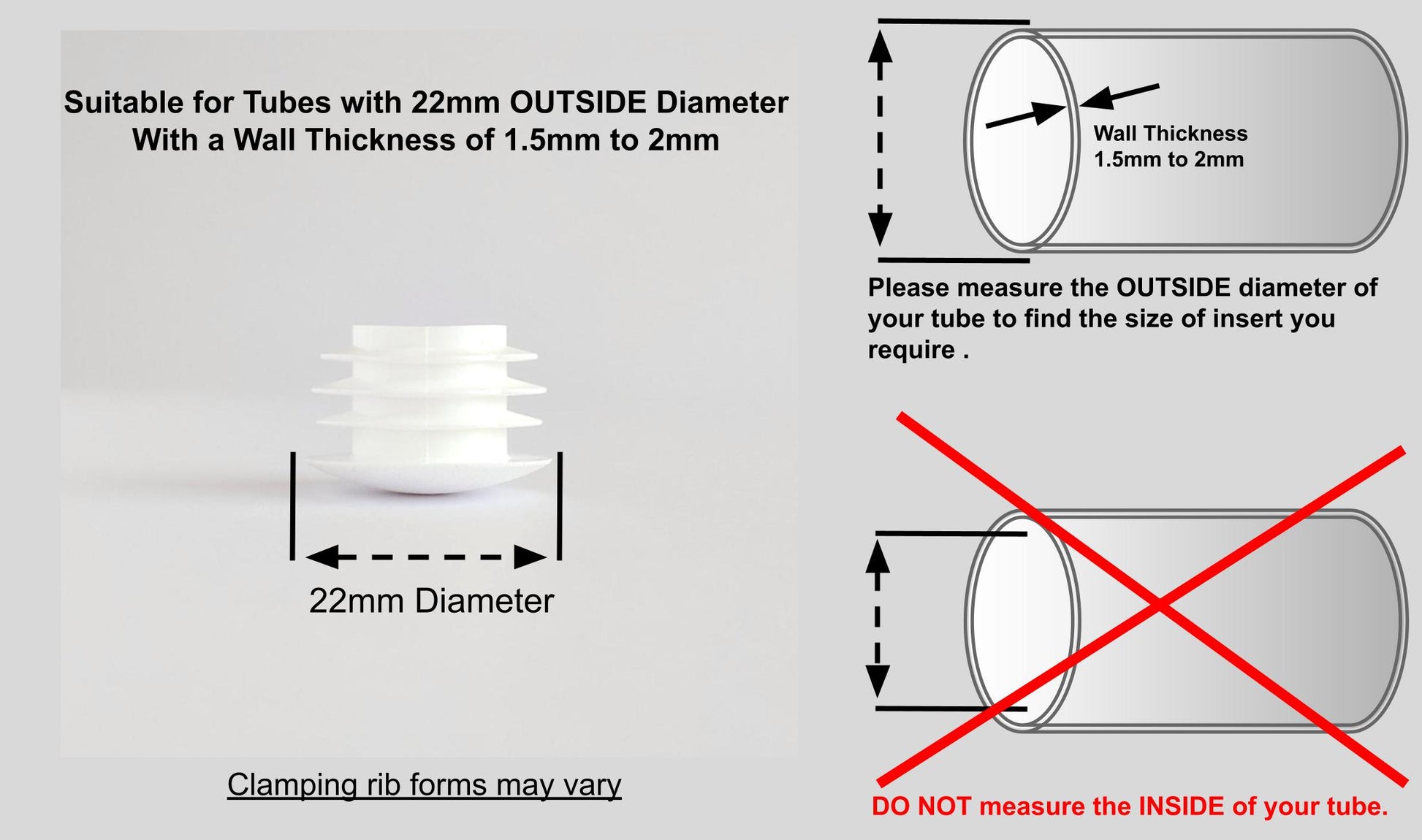 • When ordering these insert plugs, Measure the OUTSIDE diameter of the tube to find the size of insert required. These inserts are suitable for tubes with a wall thickness of 1.5mm to 2mm.