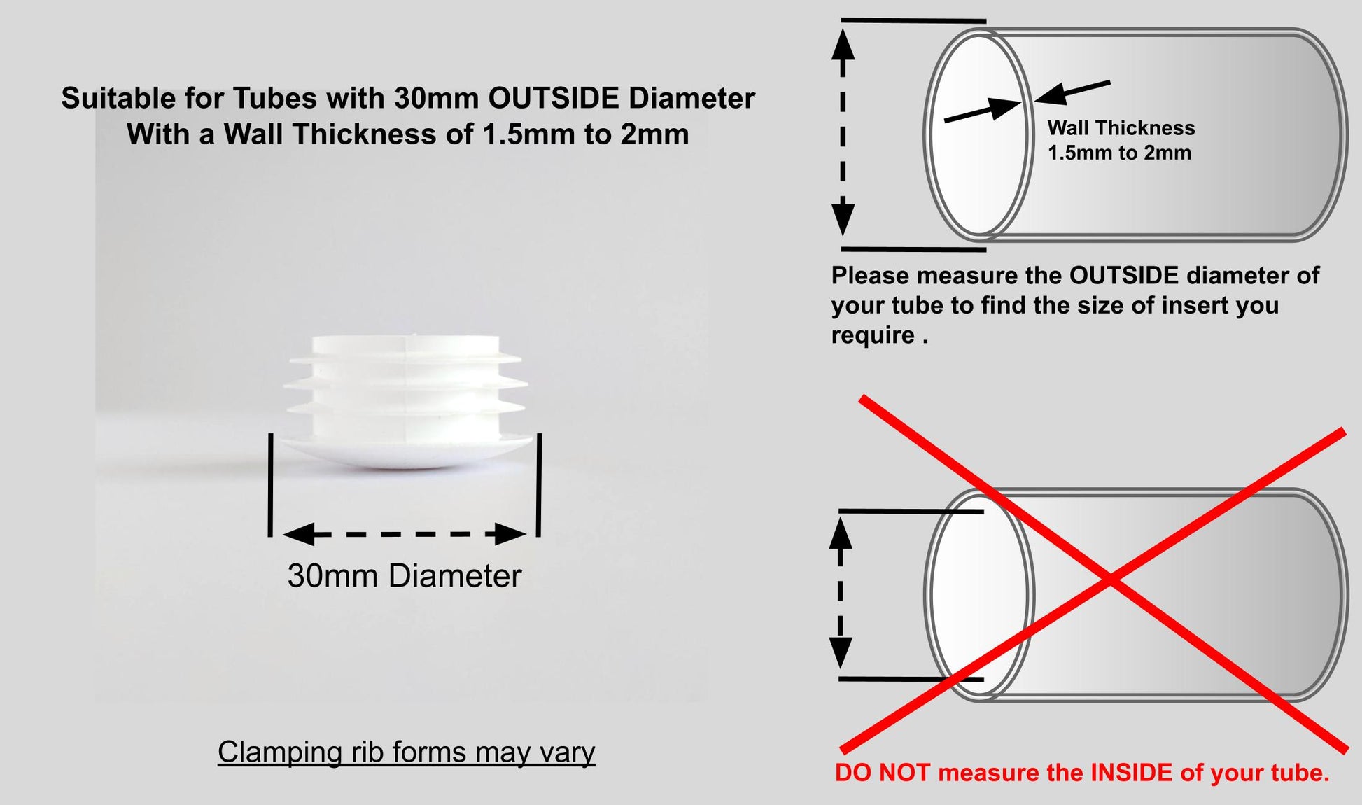 • When ordering these insert plugs, Measure the OUTSIDE diameter of the tube to find the size of insert required. These inserts are suitable for tubes with a wall thickness of 1.5mm to 2mm.