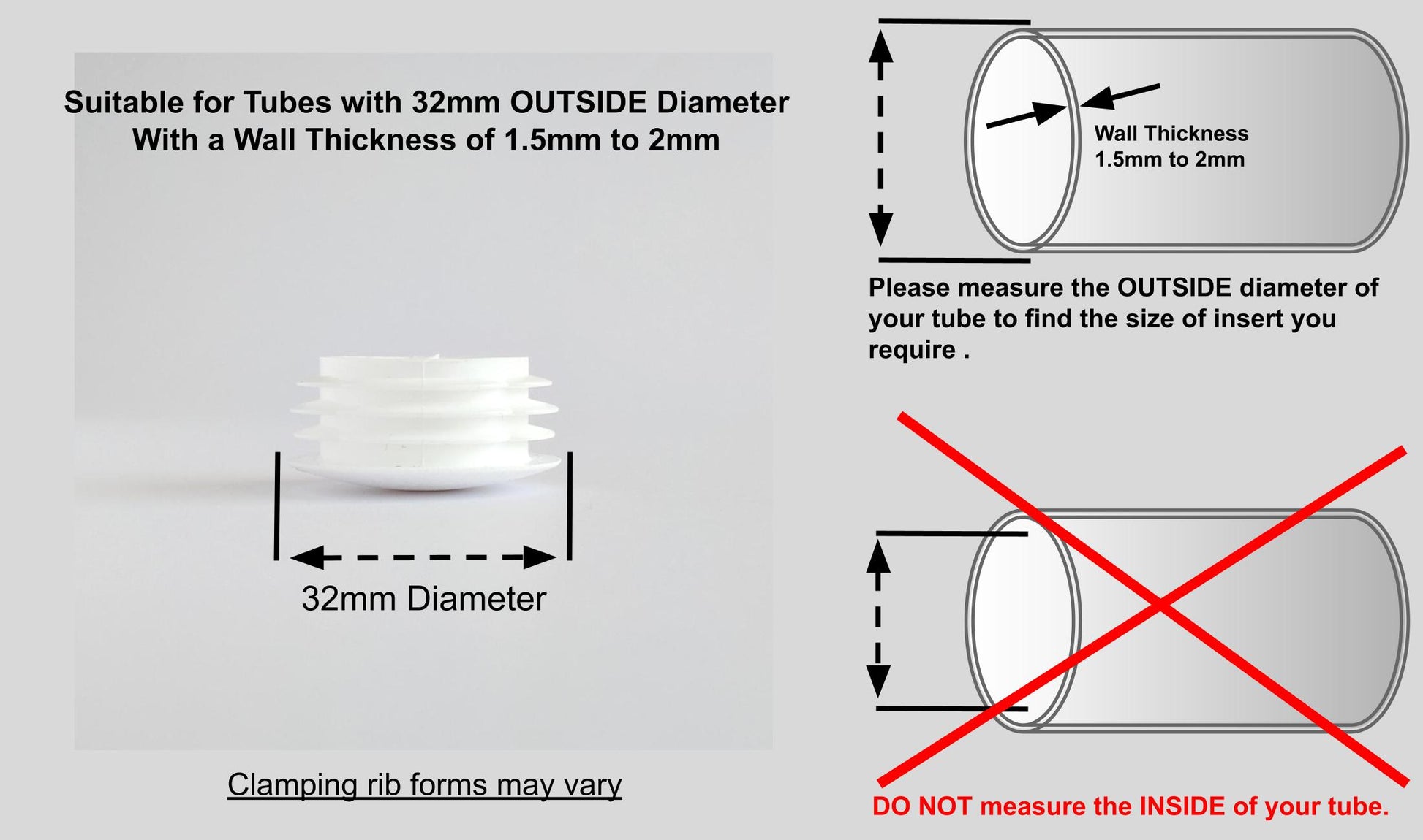 • When ordering these insert plugs, Measure the OUTSIDE diameter of the tube to find the size of insert required. These inserts are suitable for tubes with a wall thickness of 1.5mm to 2mm.