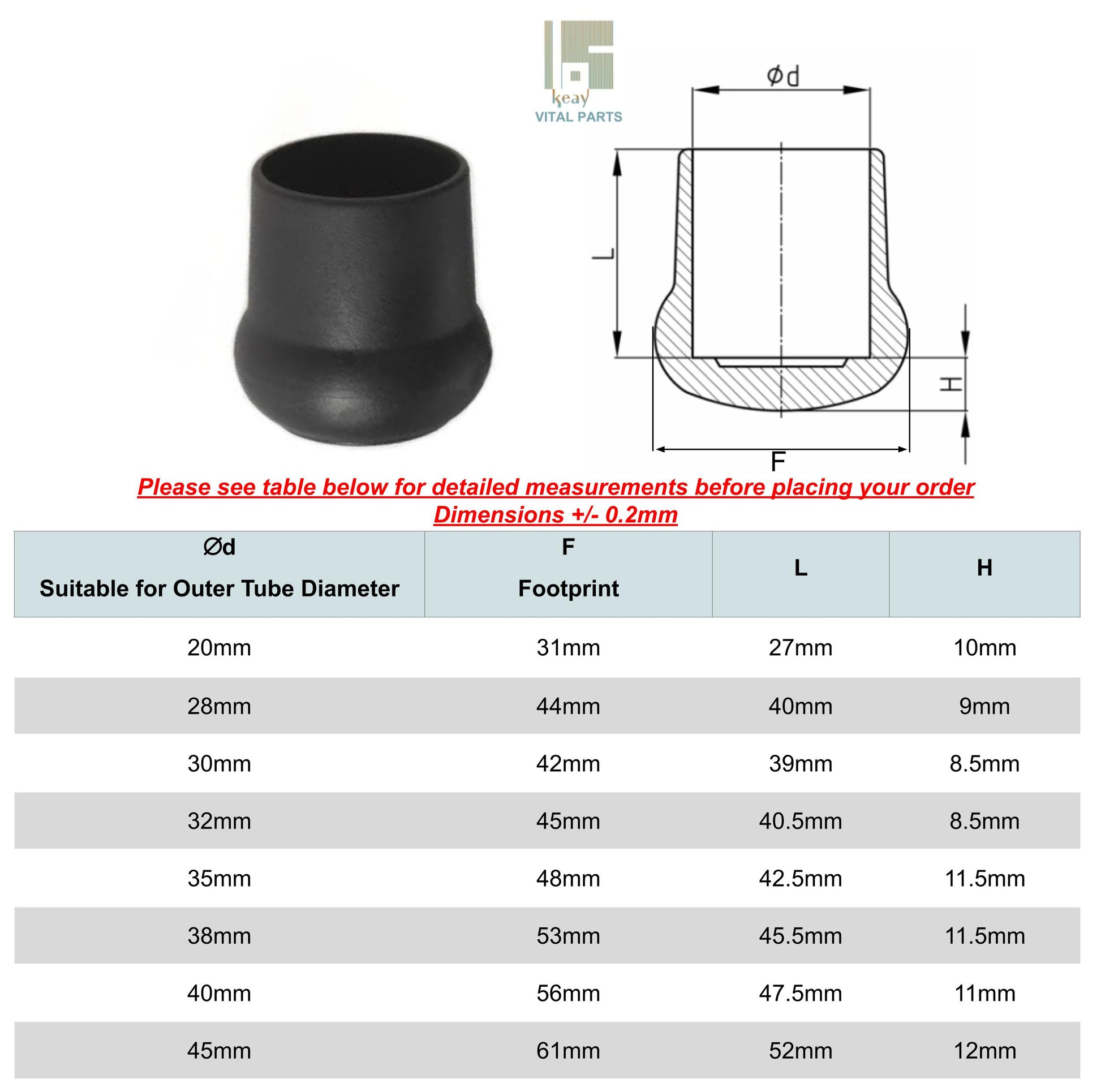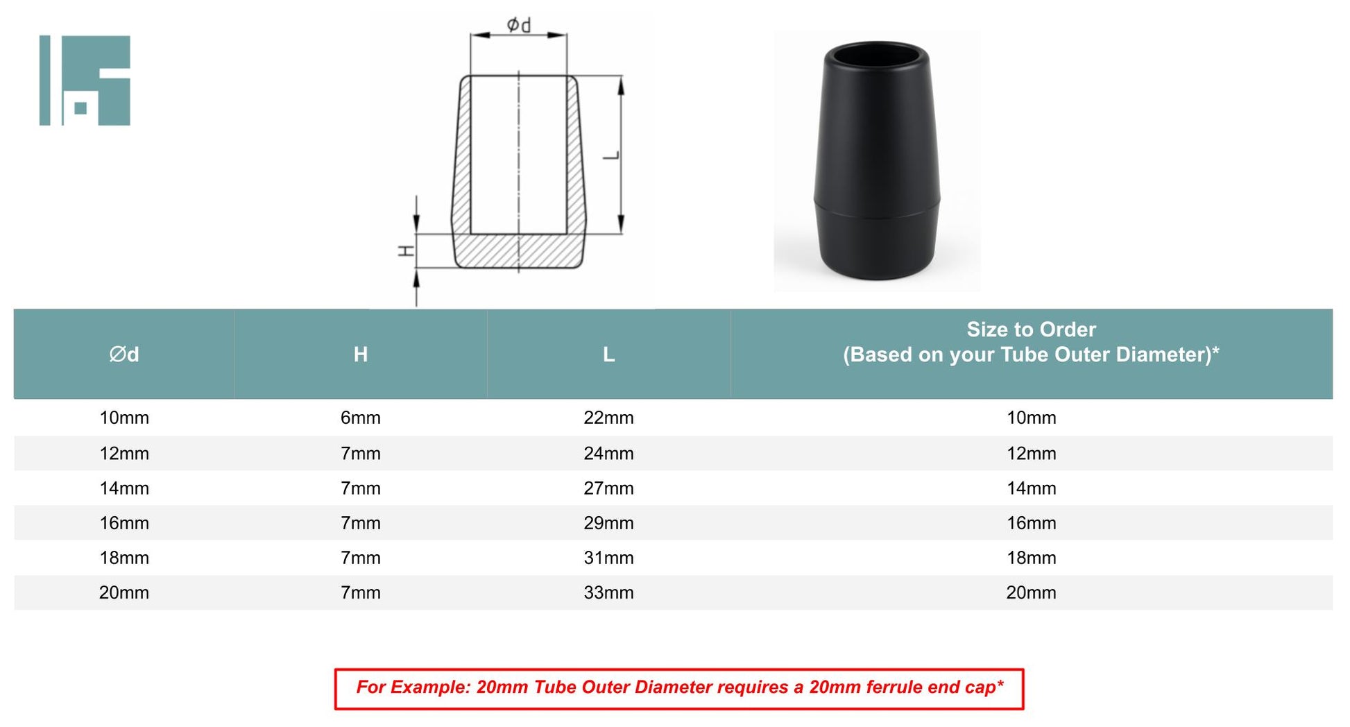 The size of the end caps is determined by the outer diameter of your tube. Measure the OUTSIDE DIAMETER of the tube to find the correct size required. For example, if the OUTSIDE DIAMETER of the tube is 20mm, then the 20mm Ferrules / End caps should fit perfectly. Please refer to the chart in the images.